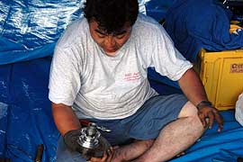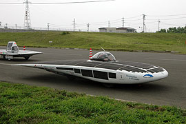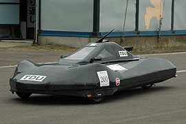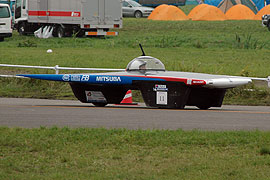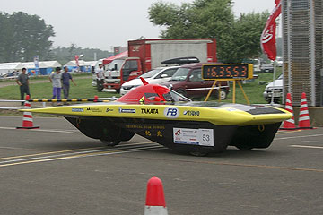 今年で燃料電池車部門への出場が3回目となるTDU東京電機大は燃料電池車「hydric impluse」を新たに投入。燃料電池車専用に開発され、低重心化を図った。2003、2004年とリタイヤしていたが、3度目の正直となるか? しかし、燃料電池の発熱が多いようであり、炎天下だとなかなかパワーを出せていないように見える。
