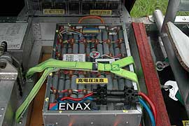 朝方に飛ばしていた再輝のENAXが、充電のためにピットに止まっていたので、リチウムイオン電池を見せてもらった。(再輝はチーム名で、ENAXが車名。リチウムイオン電池などを扱うENAX社の社名が車名となっている。)今年のENAXモジュールはLGケミカル製の最新の18650円筒型セルを使用していた。21kgのモジュールは4kWh近い容量を持っているそうで、鉛電池の1.5倍はエネルギーが多いことになる。再輝のENAXは、このリチウムイオン電池で暴れていたのか・・・。鈴鹿では、ENAX以外にもOSUや東海大翔洋高なども搭載を予定しているようなので、トリプルジャンクション太陽電池セルを積む芦屋大に対抗する武器となるだろう。ということで、なんかちょっとたじろいでいる感じにも見える?貴重な高崎さんの撮影に成功。一緒に写っているのは、呉港高等学校のF1クラスの「夢想心」のドライバーの辻さん。教職員の方ですか?とたずねると、なんと生徒さんの保護者だそうです。OBやOGとかはあったけど、保護者というパターンは珍しいですね。当然、息子さんも一緒に会場に来ています。